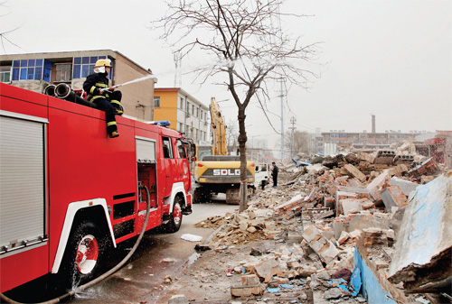 3月3日,忻府區(qū)城南片區(qū)拆遷工作全面展開,為避免城建拆除工作給周邊居民帶來(lái)的污染,忻府區(qū)領(lǐng)導(dǎo)迅速行動(dòng),安排部署區(qū)公安消防大隊(duì)消防車在拆遷現(xiàn)場(chǎng)及時(shí)進(jìn)行降塵灑水作業(yè)。圖為降塵灑水現(xiàn)場(chǎng)。(侯睿 攝)