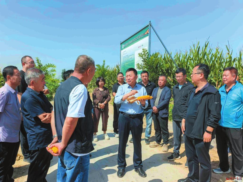 近日,定襄縣2024年玉米單產提升工程項目觀摩會成功舉辦。這場集成果展示、技術交流、經驗分享于一體的活動,讓種糧戶帶著理論知識走進田間,在實踐中解碼玉米單產提升的“科技密碼”。圖為山西農業(yè)大學玉米研究所負責人正在為參會者講解玉米單產提升工程的優(yōu)勢。(本報通訊員攝)