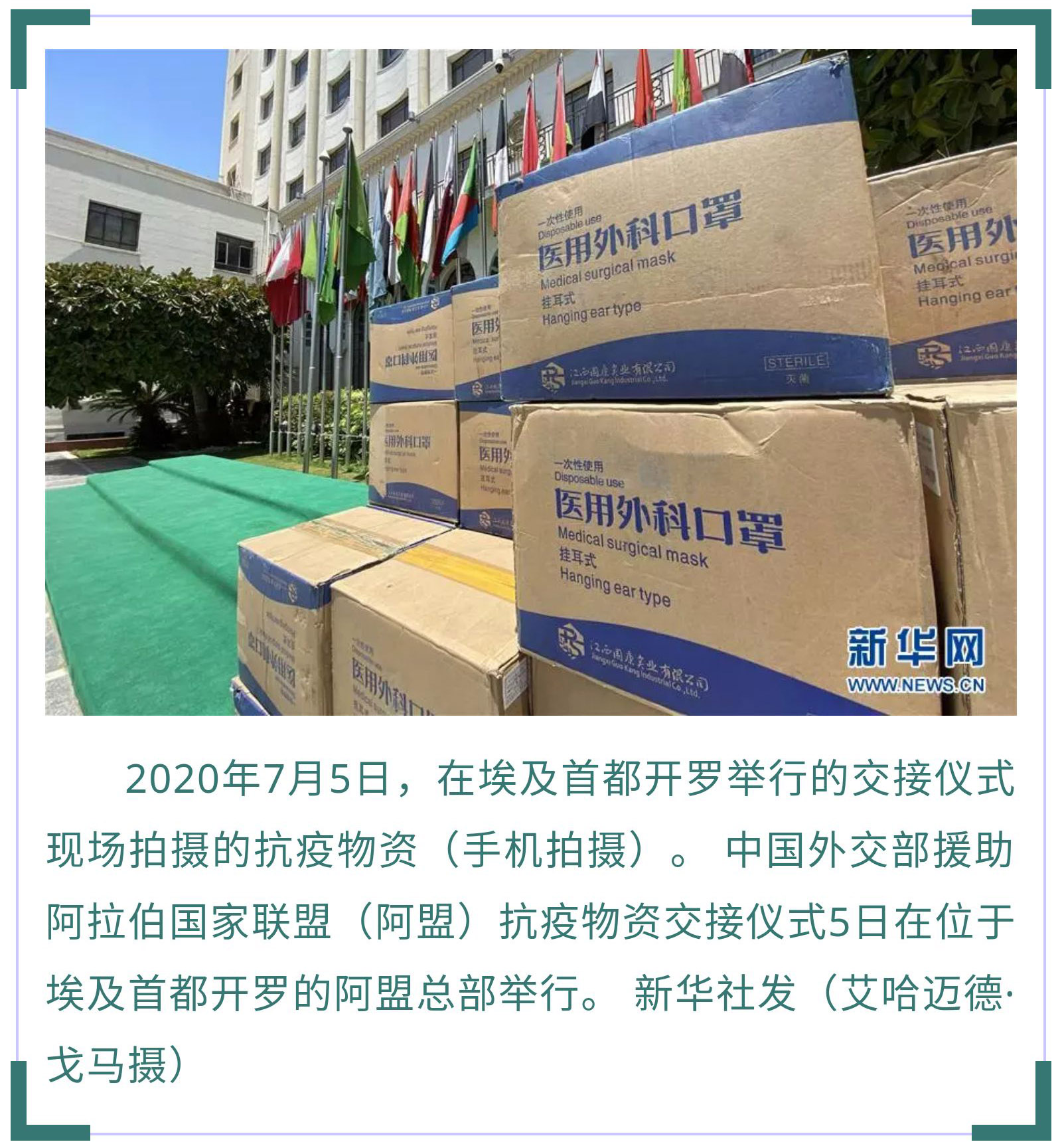 7月5日,中國外交部援助阿盟抗疫物資交接儀式在開羅舉行。中國駐埃及大使廖力強代表中國外交部向阿盟副秘書長胡薩姆·扎基移交了防護口罩。據(jù)廖力強介紹,新冠疫情暴發(fā)以來,中方向阿拉伯國家援助了大量物資,毫無保留地向阿拉伯國家分享抗疫經(jīng)驗和技術(shù),同21個阿拉伯國家舉辦了衛(wèi)生專家視頻會議,向8個阿拉伯國家派遣了醫(yī)療組,同時協(xié)助阿拉伯國家在中國采購抗疫物資,支持阿拉伯國家有序復(fù)工復(fù)產(chǎn)。