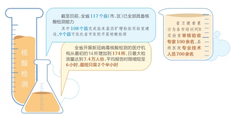 利用核酸檢測(cè)開(kāi)展大范圍篩查,是精準(zhǔn)防控疫情的有效手段。省衛(wèi)健委醫(yī)政醫(yī)管局四級(jí)調(diào)研員趙宏介紹,全省開(kāi)展新冠病毒核酸檢測(cè)的醫(yī)療機(jī)構(gòu)從最初的14所增加到174所,日最大檢測(cè)量達(dá)到7.4萬(wàn)人份,平均報(bào)告時(shí)限縮短至6小時(shí),最短只需2個(gè)半小時(shí)。