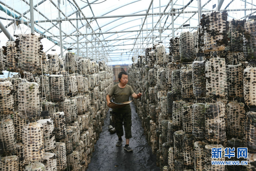 8月6日,劉振義在大棚里查看木耳生長情況。新華網曹楨攝