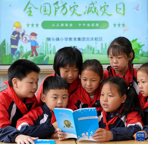 5月9日,江蘇省海安市墩頭鎮(zhèn)小學(xué)教育集團吉慶校區(qū)的學(xué)生在閱讀防震減災(zāi)讀本。(新華社發(fā) 周強 攝)