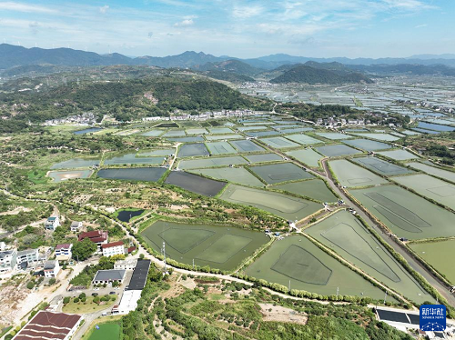 鳥(niǎo)瞰寧??h一市鎮(zhèn)的蟹塘(9月2日攝,無(wú)人機(jī)照片)。(新華社記者 翁忻旸 攝)