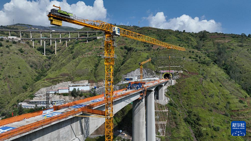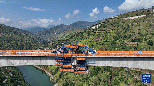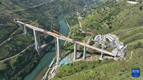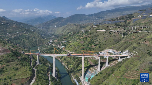 9月7日在云南省昭通市魯?shù)榭h江底鎮(zhèn)拍攝的渝昆高鐵江底牛欄江特大橋合龍現(xiàn)場(chǎng)(無(wú)人機(jī)照片)。(新華社發(fā) 張廣玉 攝)