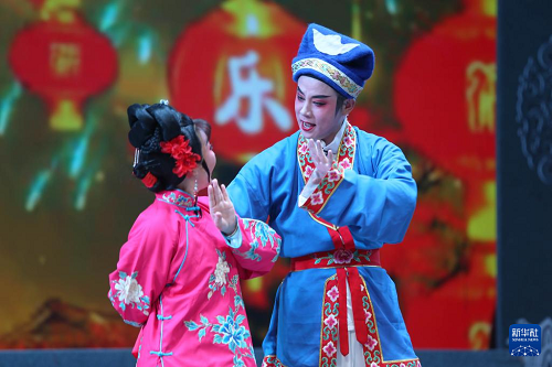 9月13日晚,在定西市隴中許鐵堂秦腔劇院,演員表演黃梅戲《夫妻觀燈》。(新華社發(fā) 王克賢 攝)