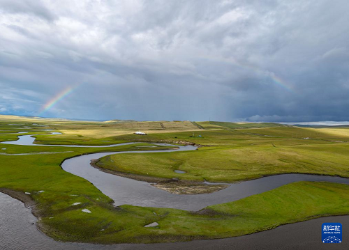 9月14日在內(nèi)蒙古呼倫貝爾市陳巴爾虎旗拍攝的彩虹下的莫爾格勒河(無人機照片)。(新華社記者 馬金瑞 攝)