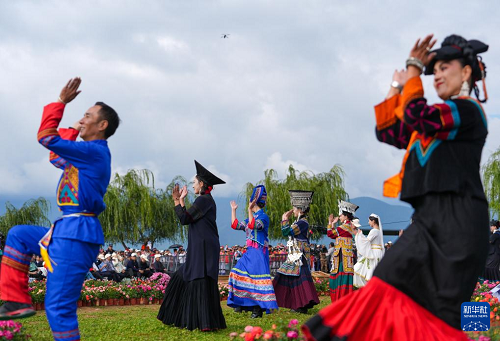 9月16日,當(dāng)?shù)厝罕娞饌鹘y(tǒng)甲搓舞歡度轉(zhuǎn)山轉(zhuǎn)海節(jié)。(新華社記者 江宏景 攝)
