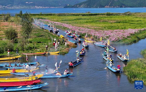 9月16日,當(dāng)?shù)厝罕婑{著豬槽船從瀘沽湖的洛洼北碼頭開始轉(zhuǎn)海(無人機照片)。(新華社記者 江宏景 攝)