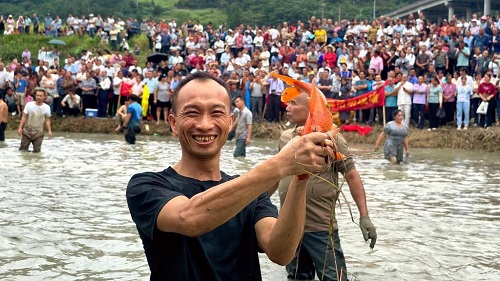 9月22日,在廣西南丹縣芒場鎮(zhèn)巴平村舉行的慶祝豐收節(jié)活動上,村民展示抓到的錦鯉。(新華社發(fā) 高東風 攝)