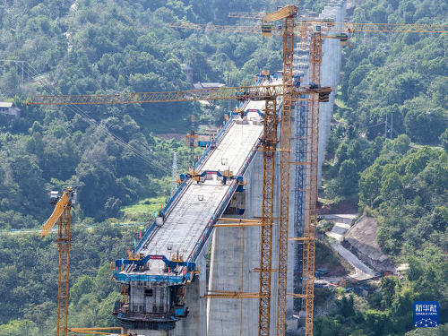 這是9月24日拍攝的渝萬(wàn)高鐵五步河雙線特大橋建設(shè)現(xiàn)場(chǎng)(無(wú)人機(jī)照片)。(新華社記者 唐奕 攝)