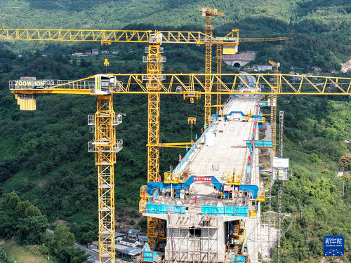 9月24日,工人在渝萬(wàn)高鐵五步河雙線特大橋建設(shè)現(xiàn)場(chǎng)施工作業(yè)。(新華社記者 唐奕 攝)