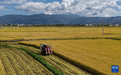 10月10日,工人在云南省大理市喜洲鎮(zhèn)水稻種植基地收割水稻(無人機照片)。(新華社發(fā) 梁志強 攝)