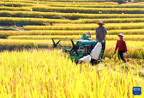 10月10日,湖北省宜昌市秭歸縣沙鎮(zhèn)溪鎮(zhèn)長春村村民駕駛農(nóng)機在田間收獲水稻。(新華社發(fā) 王罡 攝)