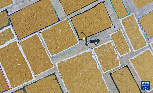 10月10日,浙江省臺州市仙居縣官路鎮(zhèn)增仁村農(nóng)民在晾曬稻谷(無人機照片)。(新華社發(fā) 王華斌 攝)