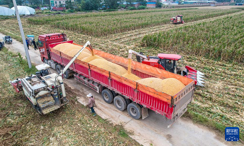 10月14日,在河南省商丘市夏邑縣會(huì)亭鎮(zhèn),收割機(jī)將收獲的玉米裝車(無(wú)人機(jī)照片)。(新華社發(fā) 王高超 攝)