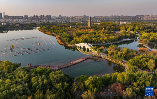 這是10月28日在銀川市海寶公園拍攝的秋景(無人機照片)。(新華社記者 馮開華 攝)