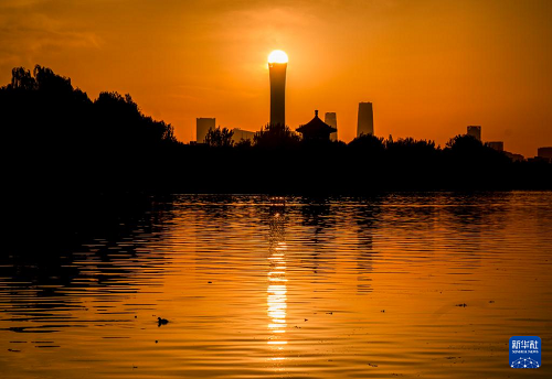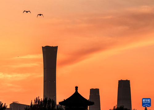11月10日清晨,北京上空晨曦微露,霞光滿天。中國尊、望海樓等地標(biāo)建筑在晨光中與什剎海光影交錯(cuò)。