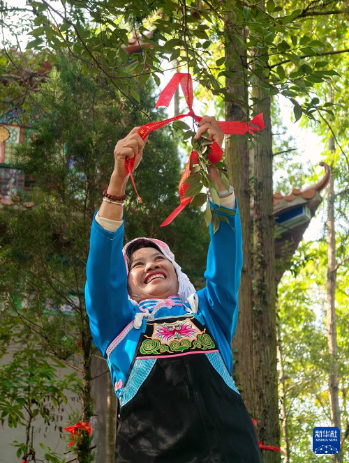 10月29日重陽節(jié),廣西南丹縣群眾按照傳統(tǒng)習俗在樹木上懸掛福壽帶。(新華社發(fā) 高東風 攝)