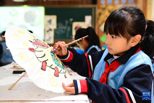 11月25日,在濟(jì)南市市中區(qū)愛都小學(xué),一庭香國畫社團(tuán)的學(xué)生在畫畫。(新華社記者 郭緒雷 攝)