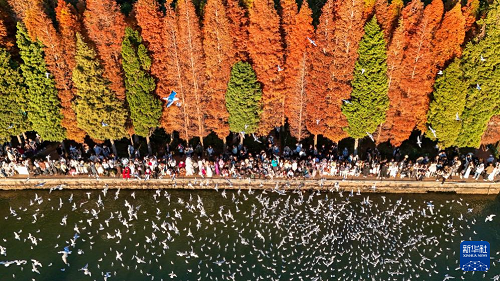 12月10日,游客在滇池畔的海洪濕地公園喂紅嘴鷗(無(wú)人機(jī)照片)。(新華社記者 彭奕凱 攝)