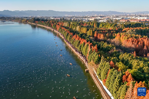12月10日在滇池畔拍攝的海洪濕地公園一景(無(wú)人機(jī)照片)。(新華社記者 彭奕凱 攝)