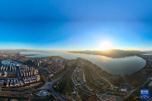 12月10日拍攝的滇池一景(無(wú)人機(jī)全景照片)。(新華社記者 彭奕凱 攝)