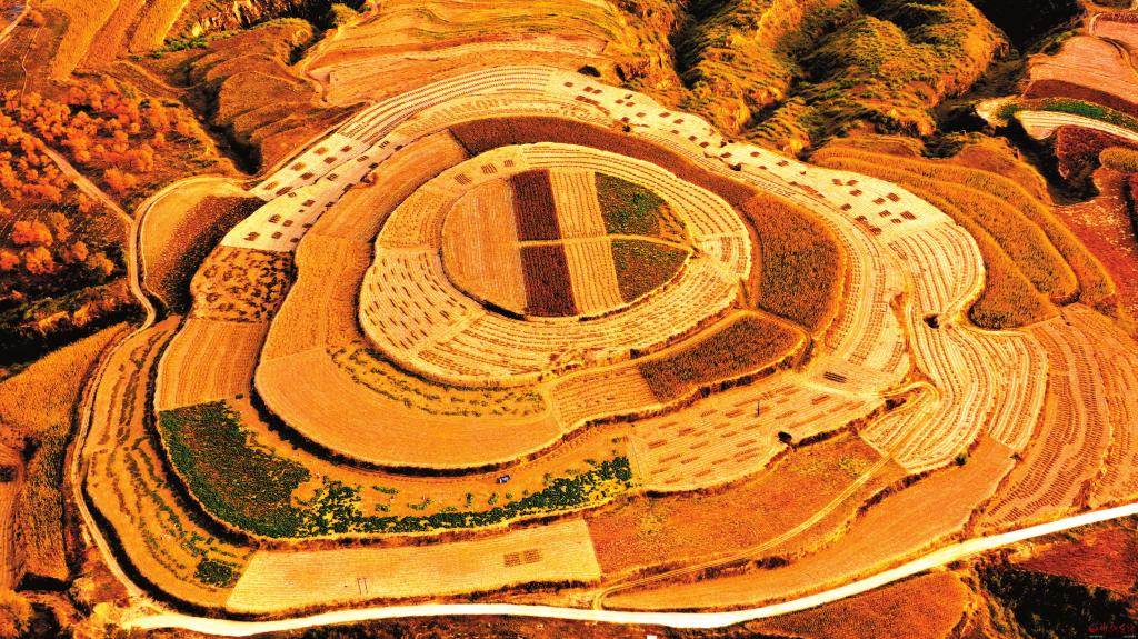 層層梯田滿目金黃,極目遠眺宛如畫卷。河曲縣鄉(xiāng)村錯落有致的梯田與曲折的道路相呼應(yīng),繪出一幅別致的田園風(fēng)光畫。(何 帥 楊成林?jǐn)z)