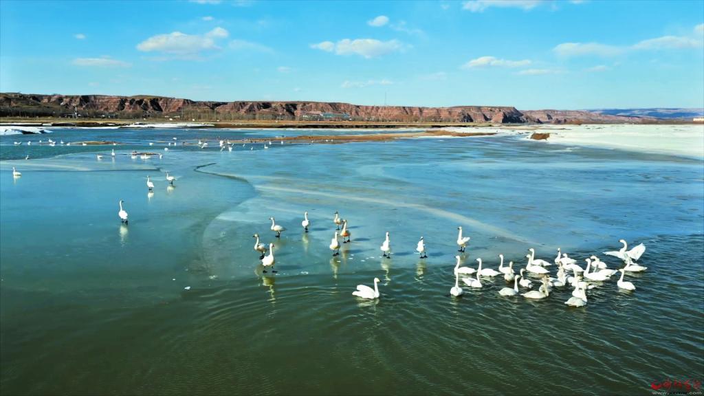 入春,黃河開河以來,成百上千的白天鵝翩躚而至,成為河曲娘娘灘水域的一道風(fēng)景線。(