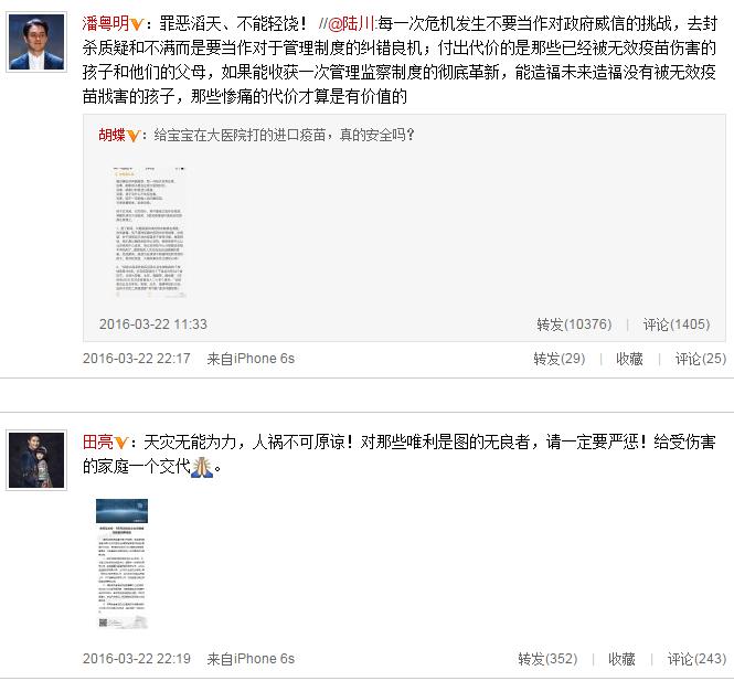 主持人胡蝶對疫苗產(chǎn)生莫大的質(zhì)疑,稱:“給寶寶在大醫(yī)院打的進(jìn)口疫苗,真的安全嗎?”隨后,陸川轉(zhuǎn)發(fā)此微博,并寫道:“每一次危機(jī)發(fā)生不要當(dāng)作對政府威信的挑戰(zhàn),去封殺質(zhì)疑和不滿而是要當(dāng)作對于管理制度的糾錯(cuò)良機(jī);付出代價(jià)的是那些已經(jīng)被無效疫苗傷害的孩子和他們的父母,如果能收獲一次管理監(jiān)察制度的徹底革新,能造福未來造福沒有被無效疫苗戕害的孩子,那些慘痛的代價(jià)才算是有價(jià)值的。”潘粵明也寫在微博下“罪惡滔天、不能輕饒”的話語。