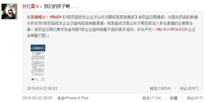 繼章子怡、賈乃亮等人在微博發(fā)聲關(guān)注疫苗安全問題后,3月22日晚,孫紅雷也在微博心痛呼叫“我的孩子……”任賢齊在微博中寫道:“請重視并嚴(yán)懲無良商人!別讓這些混蛋荼毒孩子們的健康!”舒淇、趙薇也排隊(duì)轉(zhuǎn)發(fā)并利用自身名人效應(yīng)呼吁。