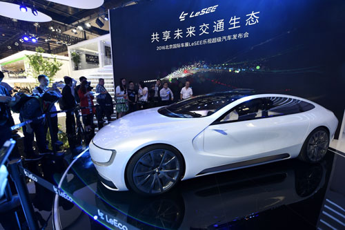 4月25日,觀眾在參觀車展展出的樂視電動汽車。當(dāng)日,2016(第十四屆)北京國際汽車展覽會在京開幕。新華社記者鞠煥宗攝