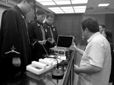 法官當庭檢查齊某提供的理療儀,發(fā)現(xiàn)是三無產品。京華時報記者鄭羽佳攝