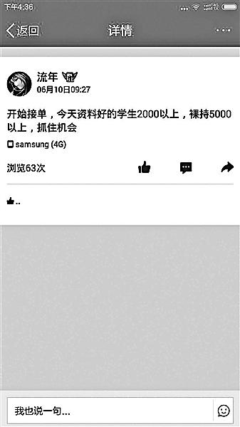 13日,記者調(diào)查發(fā)現(xiàn),在一些借款群中,女大學(xué)生“裸持”借款已經(jīng)成為公開的秘密,通過“裸持”可以借款的金額是普通借款額度的2至5倍,但逾期未還將面臨裸照被公布的威脅,甚至有借款人威脅“裸持”借款的女生提供性服務(wù)。