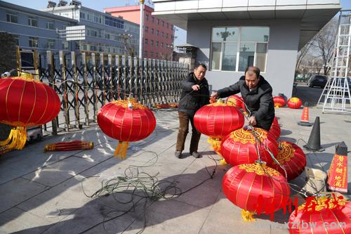 為了營造新年喜慶祥和的節(jié)日氣氛,2月4日一早,靜樂縣政府工作人員就帶上剪刀、膠帶,扛著梯子,拿著燈籠,掛起了紅紅的燈籠,向路人們表達(dá)著新年美好的祝福。圖為工作人員正在做準(zhǔn)備工作。(閆曉梅 攝)
