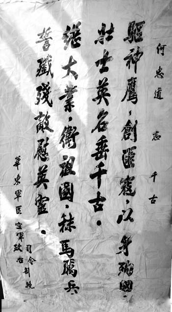 何忠道的犧牲,引起了整個空軍系統(tǒng)的震憾,人民空軍舉行了隆重的追悼大會。空軍機關、華東軍區(qū)、生前所在部隊機關、戰(zhàn)友送了幾十幀挽幛??哲娝玖顔T劉亞樓、副司令員常乾坤、副政委吳法憲、參謀長王秉璋聯(lián)名敬獻的挽幛上書:“殲滅美國侵略者,堅決保衛(wèi)祖國領空,為何忠道同志復仇!”華東軍區(qū)司令部、政治部敬獻的挽幛上書:“驅(qū)神鷹,創(chuàng)飛寇,以身殉國,壯士英名垂千古。創(chuàng)大業(yè),衛(wèi)祖國,秣馬厲兵,誓殲殘敵慰英靈?!?/p>