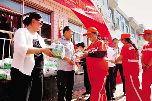領(lǐng)到粽子的環(huán)衛(wèi)工人們高興不已,市容五所的環(huán)衛(wèi)工人白新云告訴記者:“我覺得很開心,一來過節(jié)有了愛心粽子吃;二來企業(yè)送粽子給環(huán)衛(wèi)工人,是對我們工作的體諒和支持,說明大家看到了我們的付出?,F(xiàn)在環(huán)衛(wèi)工作得到越來越多人的關(guān)注,大家齊心協(xié)力為城市的整潔而努力,我們的家園一定會越來越美麗?!毕聢D為工作人員為環(huán)衛(wèi)工人分發(fā)粽子小禮盒(實習記者 許凈)