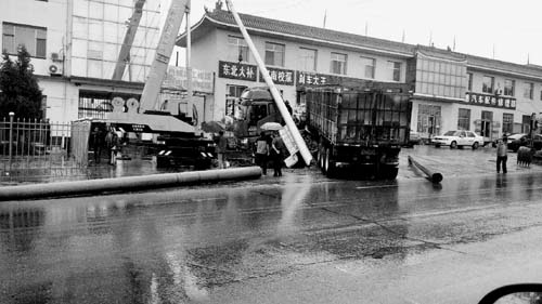 當(dāng)天夜里,五臺(tái)縣東冶鎮(zhèn)遭遇持續(xù)強(qiáng)降水天氣過(guò)程,公司調(diào)控中心值班員在凌晨3時(shí)22分發(fā)現(xiàn)10千伏829北大街線速斷掉閘,立刻電話通知所管轄區(qū)東冶供電所。得知情況后,該供電所組織搶修人員迅速趕往事故現(xiàn)場(chǎng),勘查電桿及線路受損情況。經(jīng)查勘,原來(lái)是一輛重型載貨卡車在駛經(jīng)五臺(tái)縣東冶鎮(zhèn)時(shí),因連夜大雨導(dǎo)致路面濕滑把一基電桿給撞倒了,斷裂的電桿壓在大卡車上,大卡車無(wú)法行駛。這一意外事件,造成了10千伏北大街線失電、沿線居民用電中斷。10千伏829北大街線是東冶鎮(zhèn)街道主要干線,生產(chǎn)任務(wù)繁重,能否盡快恢復(fù)送電直接關(guān)乎沿線居民的切身利益。