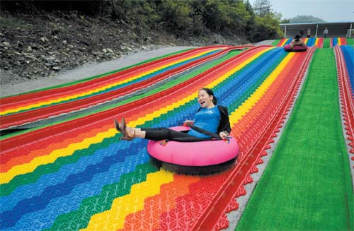 湖北省恩施土家族苗族自治州宣恩縣沙道溝鎮(zhèn)二臺坪村是個三面臨崖的高山鄉(xiāng)村,在實施精準(zhǔn)扶貧過程中,于2018年修通了進(jìn)村水泥路。隨著交通條件的改善,當(dāng)?shù)卮迕衤?lián)合成立旅游經(jīng)營公司,推進(jìn)以綠色生態(tài)為底色的“多彩鄉(xiāng)村游”,讓昔日沉寂的鄉(xiāng)村變得多姿多彩。圖為5月13日,游客在湖北省宣恩縣二臺坪村的游樂場體驗滑草樂趣。