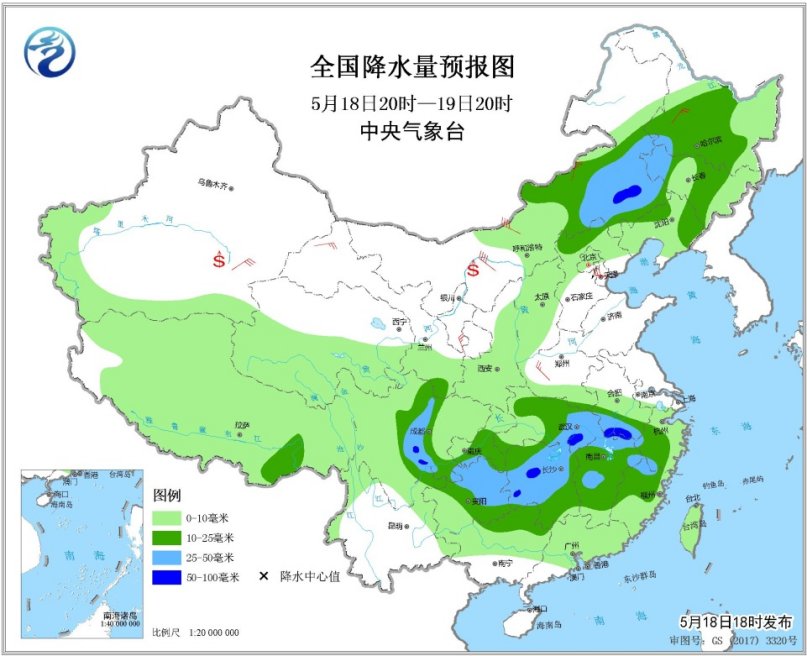 5月18日20時至19日20時,內(nèi)蒙古中東部、東北地區(qū)中部、四川盆地西部、西南地區(qū)東部、江漢、江南等地的部分地區(qū)有中到大雨,其中內(nèi)蒙古東南部、四川盆地西南部、湖南北部、湖北南部、安徽南部等地局地有暴雨(50~80毫米),上述部分地區(qū)有短時強降水,局部并伴有雷暴大風等強對流天氣。西北地區(qū)中東部、內(nèi)蒙古大部、華北、東北等地的部分地區(qū)有5~7級風,局地陣風8~9級。內(nèi)蒙古西部、南疆盆地等地有揚沙或浮塵天氣。