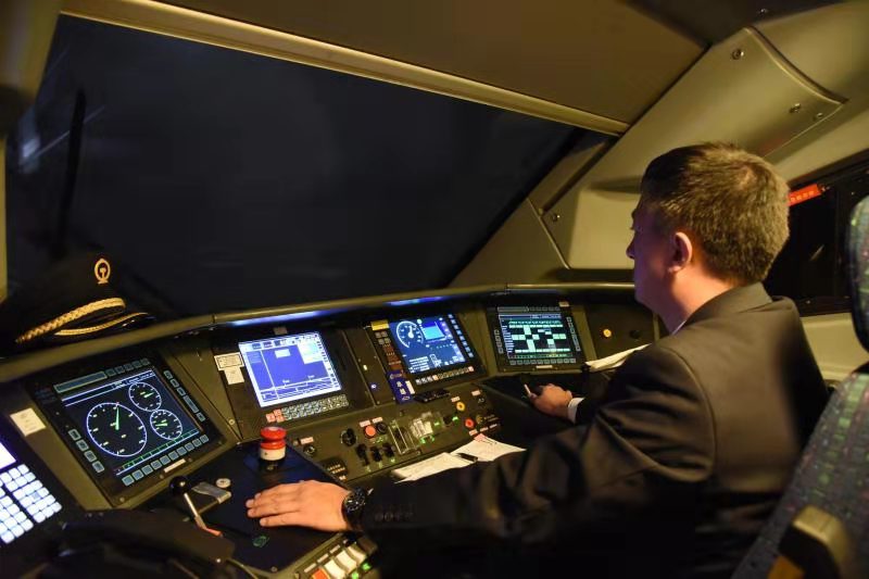 當(dāng)D6770次列車到達(dá)呼和浩特東站,弓國慶登上機(jī)車,與換班司機(jī)交接完畢后,插入IC卡,認(rèn)真核對行車數(shù)據(jù)、確認(rèn)操縱臺各儀表……各項(xiàng)安全準(zhǔn)備工作無誤后,隨著機(jī)車前方發(fā)車信號變?yōu)榫G燈,與車站進(jìn)行車機(jī)聯(lián)控確認(rèn),隨著一聲汽笛長鳴,動車組緩緩駛出呼和浩特東站?!皬氐撞t望,確認(rèn)信號,高聲呼喚,手比眼看”的標(biāo)準(zhǔn)化作業(yè)與每三十秒腳踩提醒踏板的一系列操作流暢默契……盡管這種周而復(fù)始的工作他已重復(fù)了成千上萬遍,但從不敢松懈。
