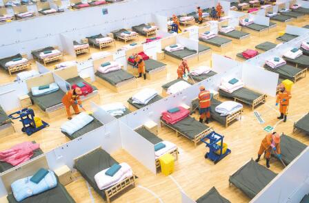 2月12日,在武漢體育中心方艙醫(yī)院,工人在進行整理和清潔工作。