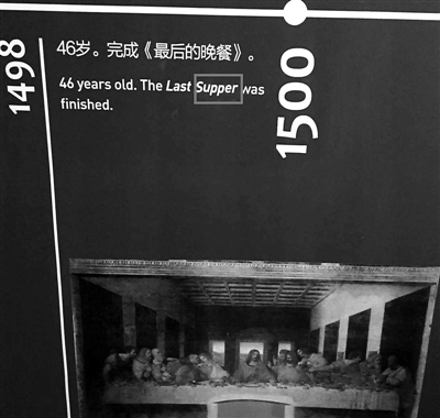 該網(wǎng)友發(fā)現(xiàn),在這個介紹達·芬奇生平的年表上,英文錯誤不止一處:關(guān)于達·芬奇46歲的經(jīng)歷,展覽介紹說:“46歲。完成《最后的晚餐》”,其對應的英文翻譯是“46 years old. The Last super was finished.”而super一詞在英文中的意思是“超級的”,“晚餐”的英文詞匯實為supper,該翻譯中少了一個字母“p”。