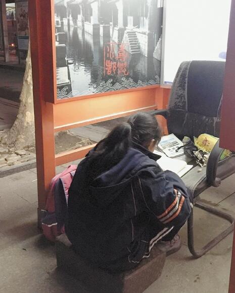 照片上這個(gè)四面漏風(fēng)的電話亭,是嘉興12歲女孩曉華的“書房”,一把舊椅子當(dāng)書桌,沙發(fā)坐墊當(dāng)?shù)首?,每天借著昏暗的照明燈看書做作業(yè)。