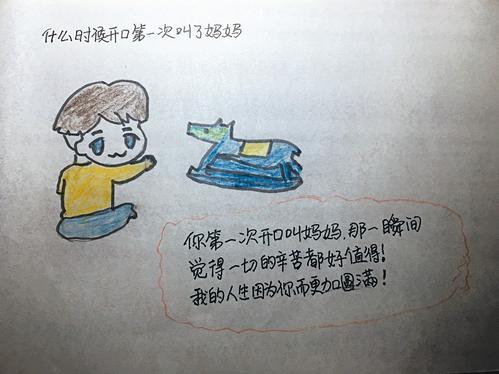 漫畫中,媽媽抱著襁褓里的嬰兒傷心地哭泣著,這是焦洋畫的漫畫中的一幅,是最揪心的一幅漫畫。旁邊配著焦洋用中性筆工工整整寫的大片文字。“因?yàn)榍闆r危急,媽媽早產(chǎn)一個(gè)月,你出生就要和媽媽分開,你被送去另一個(gè)醫(yī)院……媽媽每天祈禱,盼著你快快出院,終于在半個(gè)月后把你從醫(yī)院抱回來,那是媽媽第一次抱你,看著你個(gè)小人兒從此與我息息相關(guān)。仿佛那一瞬間明白了責(zé)任是什么,謝謝你寶貝,讓我邁入人生的另一個(gè)階段?!?br /> 焦洋今年33歲,在8年前,她生下兒子派派。孩子的出生并不順利,早產(chǎn)了一個(gè)月,因?yàn)槿毖酰t(yī)生甚至都建議家人放棄這條小生命。可是焦洋堅(jiān)決不放棄,只要有一絲希望就得拼盡全力?!爸宦牭揭宦暱奁缶捅会t(yī)生抱走,放進(jìn)保溫箱,我都沒看到他的模樣,讓我放棄,絕對(duì)不會(huì)同意的?!苯寡笳f,因?yàn)楹⒆右怀錾臓顩r非常糟糕,她只好獨(dú)自出院,留下還在保溫箱里的孩子。