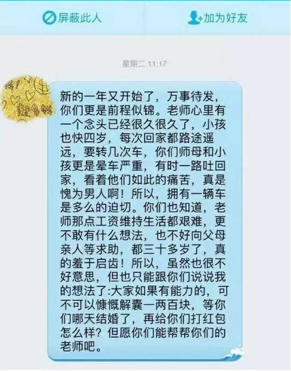 網(wǎng)帖中還上傳了數(shù)張疑似該老師與學生的QQ聊天截圖,其中的一張截圖中的對話道出了老師“眾籌”買車的原因:“新的一年又開始了,萬事待發(fā),你們更是前程似錦。老師心里有個念頭已經(jīng)很久了,小孩也快四歲了,每次回家都路途遙遠,要轉幾次車,你們師母和小孩更是暈車嚴重,有時一路吐回家,看看他們?nèi)绱送纯啵媸抢槟腥税。∷?,擁有一輛車是多么的迫切。你們也知道老師那些工資維持生活都很艱難,更不敢有什么想法,也不好向父母親人求助,都三十多歲了,真的羞于啟齒!所以,雖然也很不好意思,但是也只能跟你們說說我的想法了:大家如果有能力的,可不可以慷慨解囊一兩百塊,等你們哪天結婚了,再給你們打紅包怎么樣?但愿你們能幫幫你們的老師吧?!?/p>