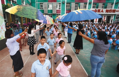2016年9月1日,海淀區(qū)雙榆樹(shù)一小,家長(zhǎng)撐起手繪的傘歡迎一年級(jí)新生。按照北京市當(dāng)時(shí)規(guī)定,凡年滿6周歲(2010年8月31日以前出生)的兒童參加信息采集,不滿6周歲(2010年8月31日以后出生)的兒童不能采集。資料圖片/新京報(bào)記者 浦峰 攝