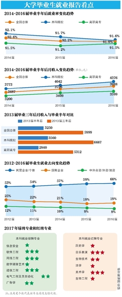 報告調(diào)查分析顯示,2016屆本科畢業(yè)生半年后月收入達(dá)到4367元,比2015屆增長334元。從各專業(yè)就業(yè)率、收入和就業(yè)滿意度等方面數(shù)據(jù)分析,信息安全、軟件工程等專業(yè)因就業(yè)率高、薪資好被列為“綠牌專業(yè)”;歷史學(xué)、美術(shù)學(xué)等專業(yè)被列為“紅牌專業(yè)”。