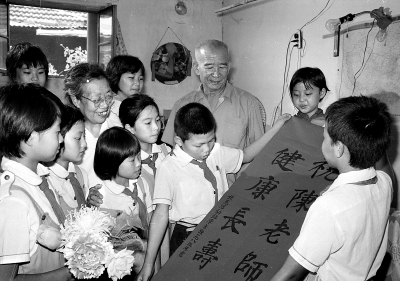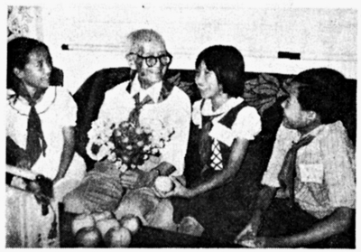 1985年教師節(jié)前夕,朝陽區(qū)三里屯三小的學(xué)生慰問“故事爺爺”孫敬修。楊金華/攝