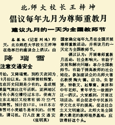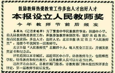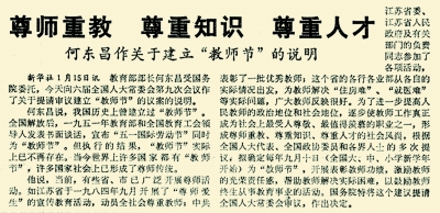 其實,這并非我國第一次提出“教師節(jié)”的概念。據(jù)本報1985年1月16日1版《何東昌作關(guān)于建立“教師節(jié)”的說明》一文記載,新中國成立后,1951年教育部和全國教育工會領(lǐng)導(dǎo)人發(fā)表書面談話,宣布“五一國際勞動節(jié)”同時為“教師節(jié)”。但執(zhí)行的結(jié)果是“教師節(jié)”實際上并不存在。