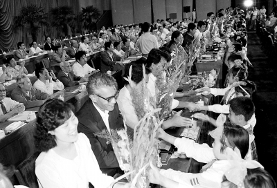 ▲1989年北京市慶祝教師節(jié)表彰大會上,少先隊員向優(yōu)秀教師和優(yōu)秀教育工作者代表獻花。葉用才/攝